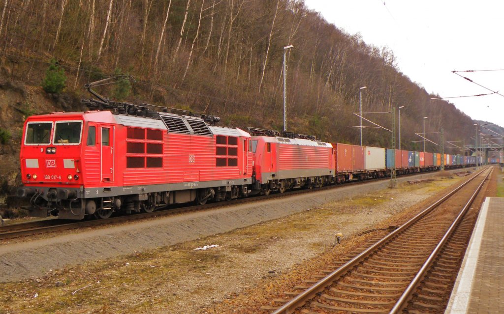 Am 10.April 2012 erreicht 180 017 mit einer 189er im Schlepp und einem Containerzug den Bahnhof Bad Schandau.