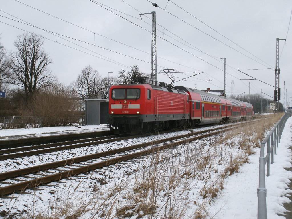 Auf der Fahrt,von Sassnitz nach Rostock,hielt 112 108 mit dem RE 13010,am 07.Februar 2013,in Teschenhagen.