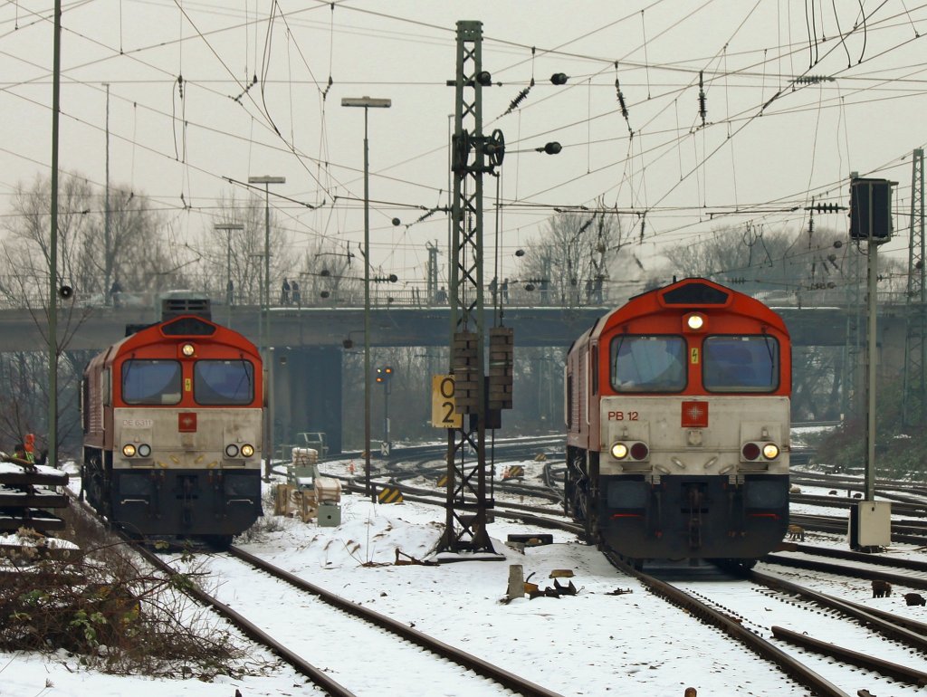 Ballett mit zwei Damen von Crossrail. DE6311 (Hanna) stand am 23.01.2013 vor PB12 (Marleen) auf einem Stumpfgleis in Aachen West. Da Marleen einen Containerzug nach Belgien schleppen soll, muß Hanna erstmal Platz machen und auf ein anderes Gleis ausweichen, damit Marleen zu ihrem Zug gelangen kann. Anschließend fährt Hanna wieder zu ihrem alten Platz zurück und wartet dort auf ihren nächsten Auftrag.