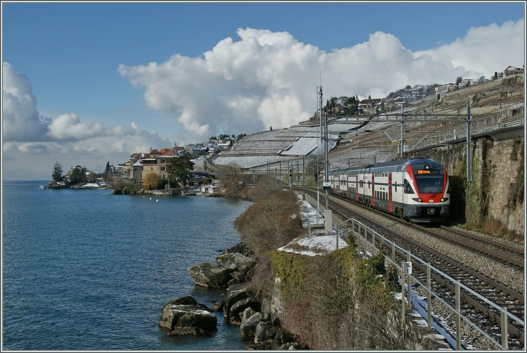 Bild 1) Seit Fahrplanwechsel verkehren die neuen "KISS" stündlich als RE bis nach Vevey. Interessant ist nun, wie der "Winter" im Lavaux "abperlt": Zwar nur ein Hauch Winter aber immerhin "Winter"... 8. II. 13