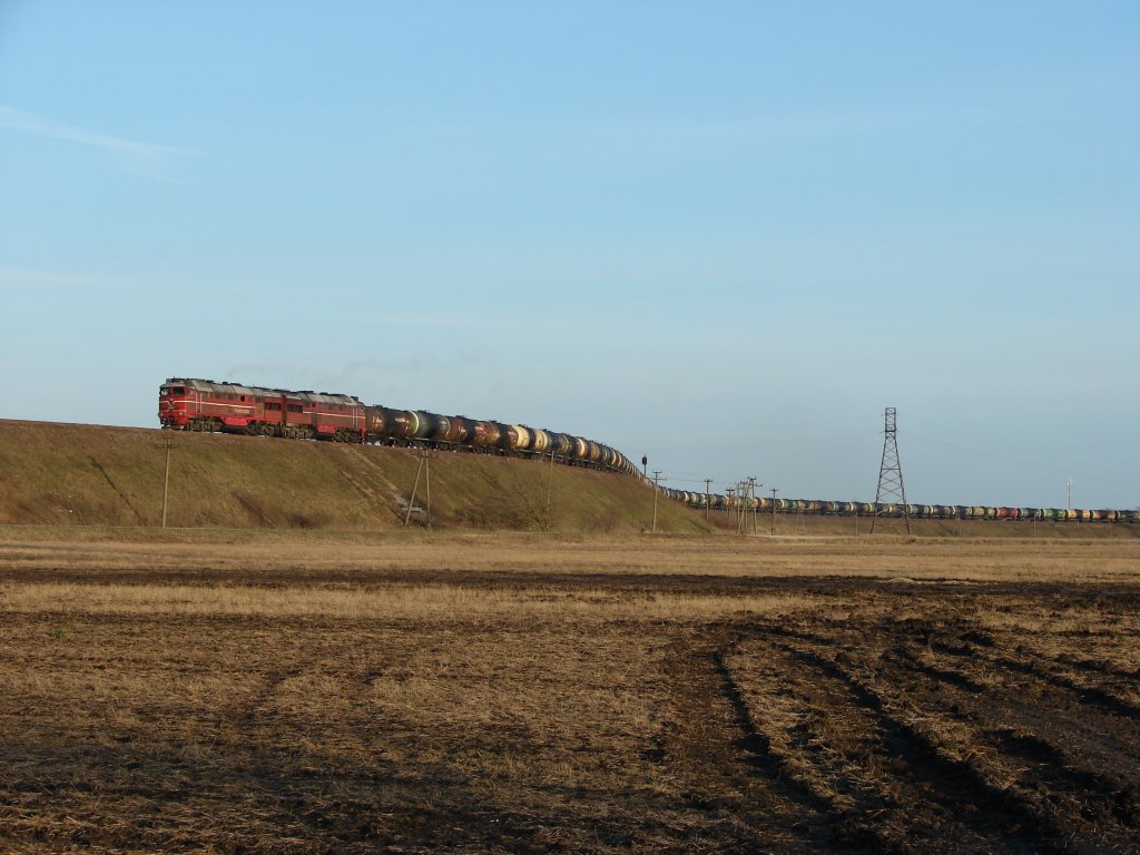 Eine 2T3116 arbeitet sich die Steigung zur Überführung über die Schnellstrasse nach Narva mit einem Ölzug (~6500tons brutto) hinauf - 15/04/2008