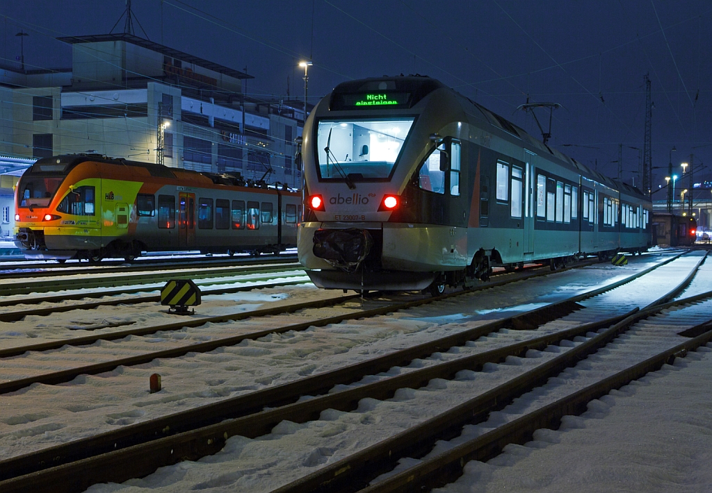 ET 23007 (3-teiliger Stadler Flirt) der Abellio Rail NRW ist am 08.02.2013 (0:05 Uhr) beim Hbf Siegen abgestellt, dahinter ein 5-teiliger Flirt 429 544 / 044 der HLB (Hessischen Landesbahn).
