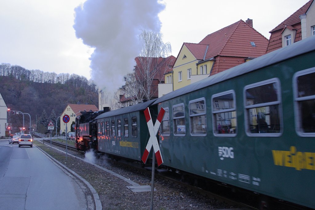 Hier verläßt 99 1771 mit P5007 am Nachmittag des 31.12.2012 zügig den Haltepunkt Freital-Coßmannsdorf in Richtung Endbahnhof Freital-Hainsberg. Die verdiente Kaffeepause für`s Lokpersonal wartet! Also wird nochmal richtig Dampf gegeben!!