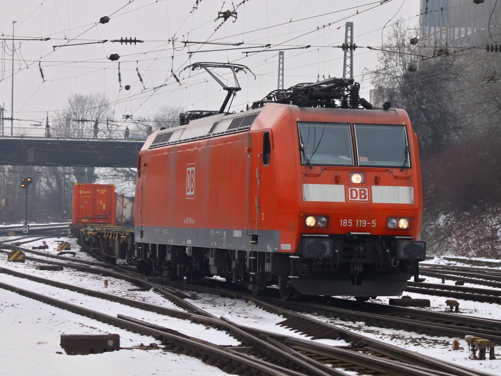 Mit einem nur teilweise beladenen Containerzug am Haken kommt 185 119-5 am 23.01.2013 in Aachen West an. Von hier wird der Zug von einer Cobra übernommen und weiter nach Belgien geschleppt.