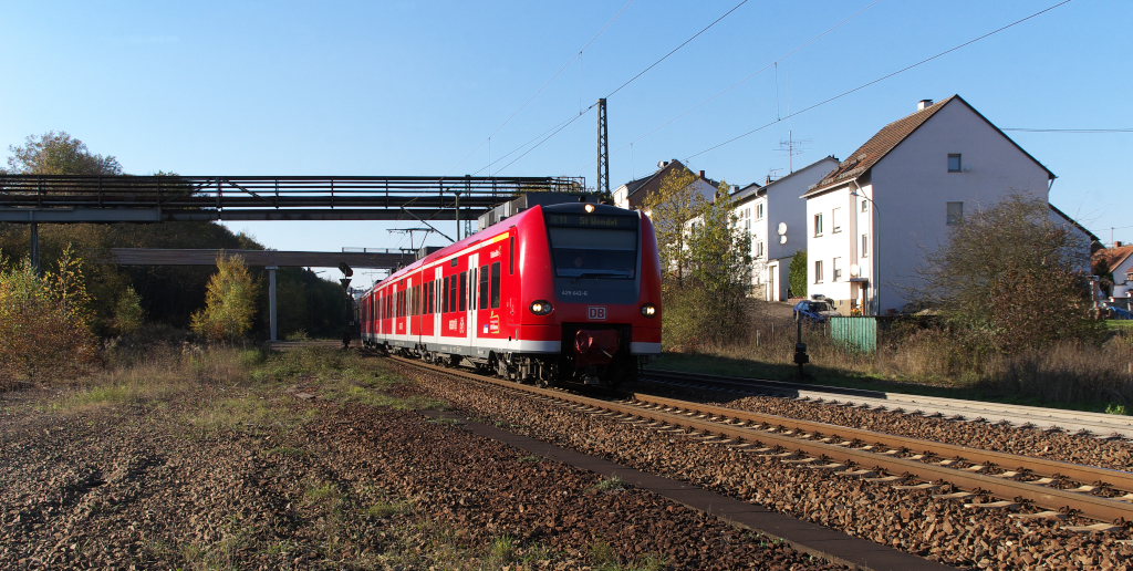 Nicht im Takt sondern nur sporadisch... verkehrt die Linie RE 11 im Saarland. Saarhölzbach - St. Wendel heißt die Fahrtroute, die über zwei Kursbuchstrecken führt. KBS 685 im Saartal von Saarhölzbach bis Saarbrücken Hbf. und dann ab Saarbrücken über die KBS 680 durch das Sulzbachtal nach Neunkirchen und weiter nach St. Wendel. Zwischen Neunkirchen und St. Wendel wird das Flüsschen Blies einige male überquert. 425 142 als RE 12106 bei Neunkirchen-Sinnerthal. Früher lag ein drittes Gleis auf der linken Seite vom Rbf. Neunkirchen bis zum Bergwerk Reden