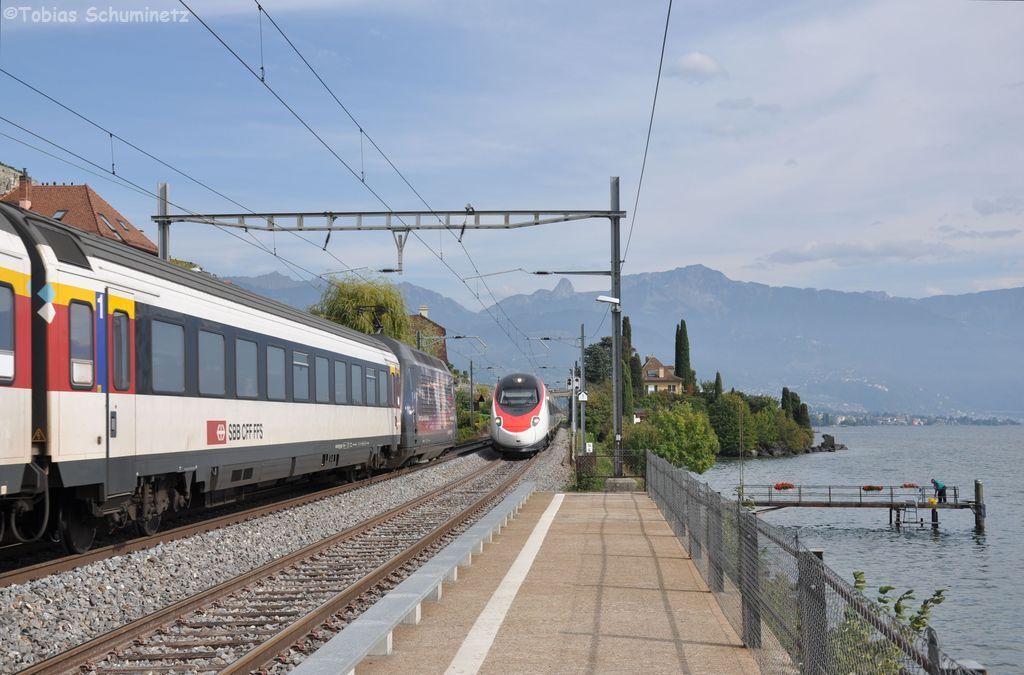 Zugbegegnung zwischen einem Cisalpino und einem Interregio am 23.09.2012 in St. Saphorin