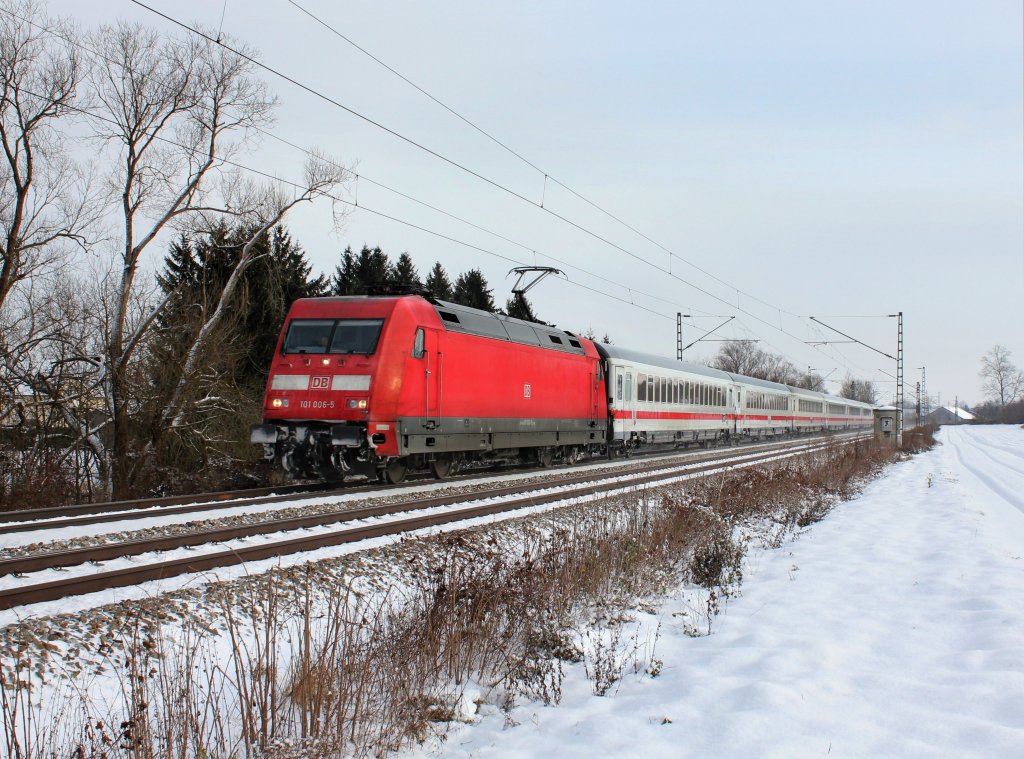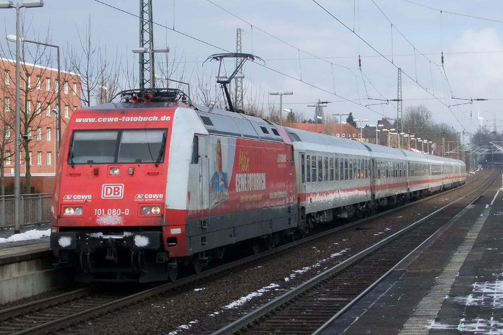 101 083-4 fuhr am 09.02.2013 mit dem IC 2431 von Emden Außenhafen nach Berlin Ostbahnhof, hier bei Veenhusen.