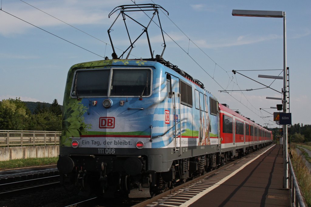 111 066 schiebt am 22.8.12 einen RE durch Thüngerheim.
