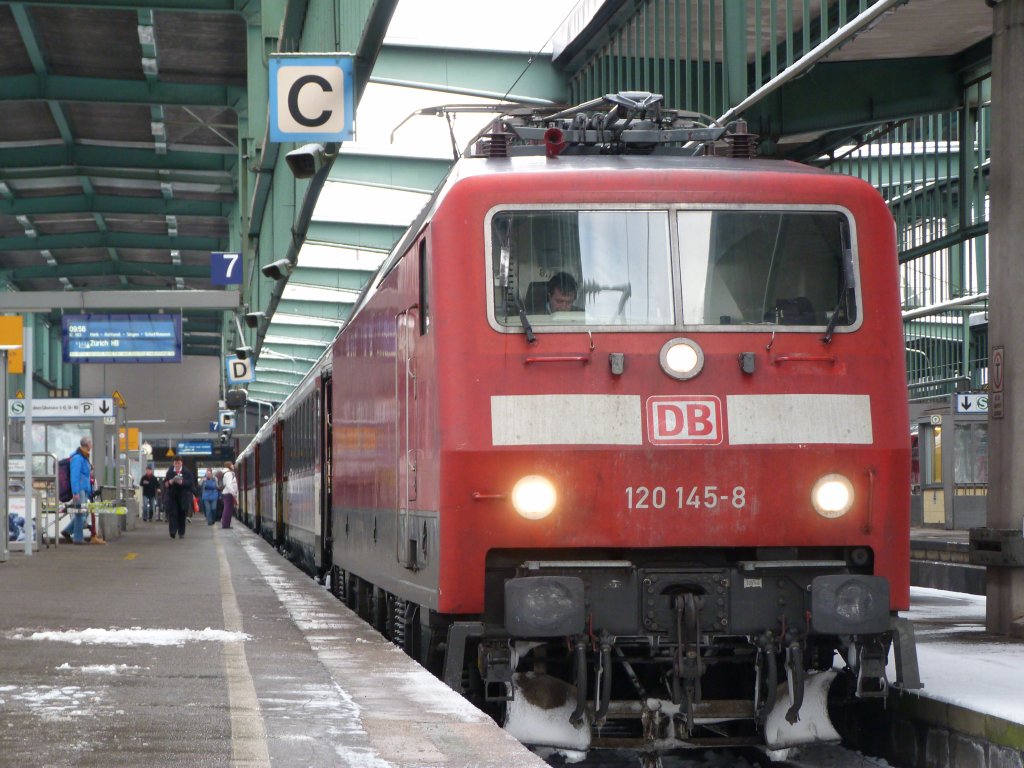 120 145 steht am 09.02.13 mit einem IC nach Zürich am Hbf in Stuttgart zur Abfahrt bereit.