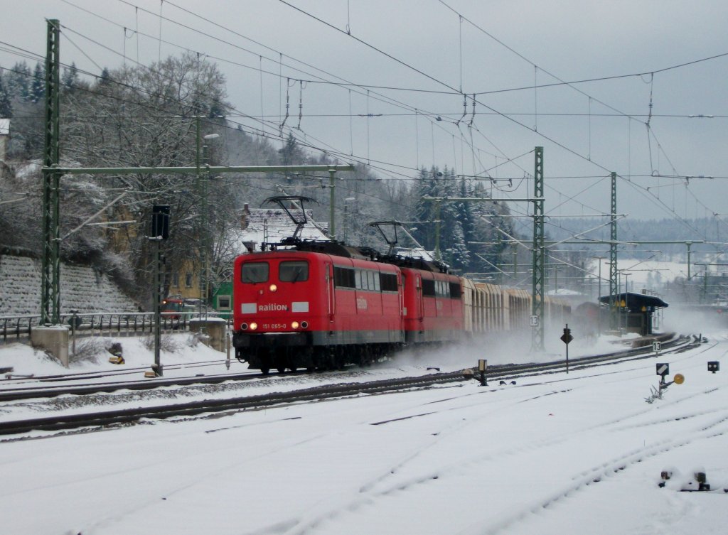 151 065-0 und eine weitere 151er ziehen am 09. Februar 2013 einen gemischten Güterzug durch Kronach in Richtung Lichtenfels.