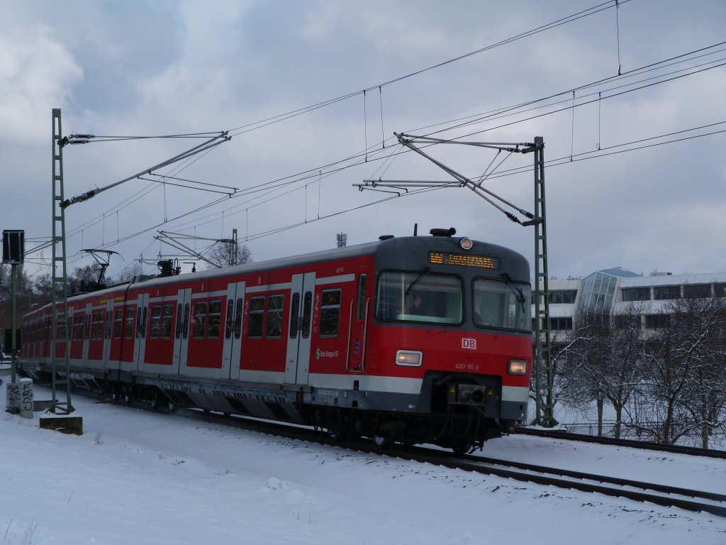 420 911 der S-Bahn Stuttgart fährt am 09.02.13 aus dem Bahnhof Oberaichen in Richtung Flughafen/Messe aus. Liebe Grüße an den Tf!