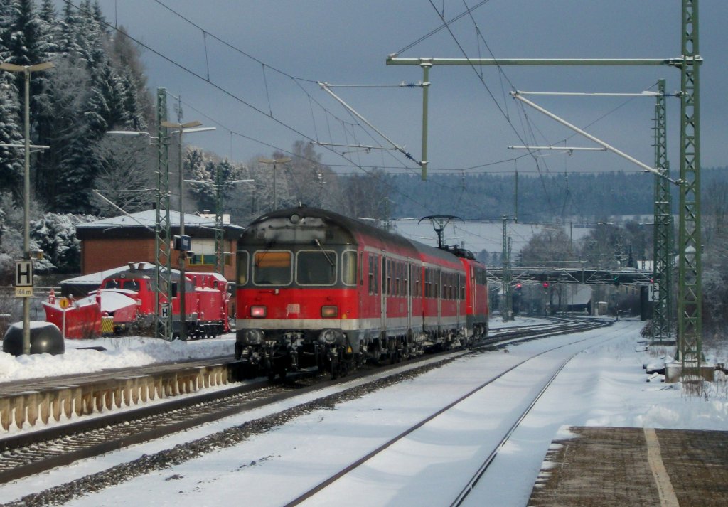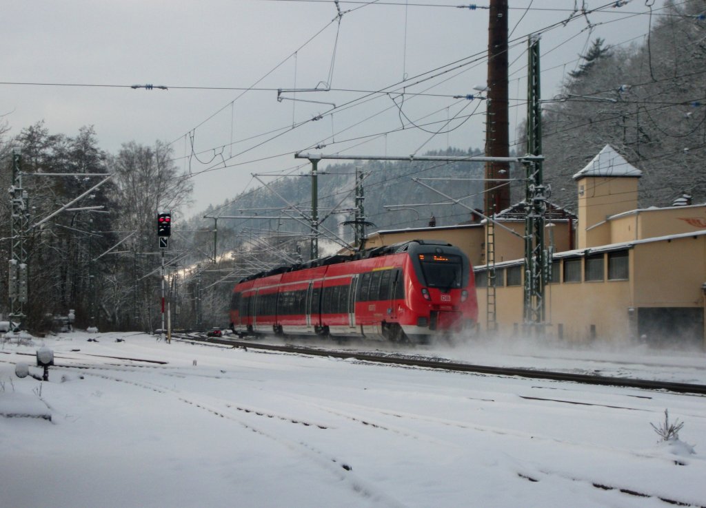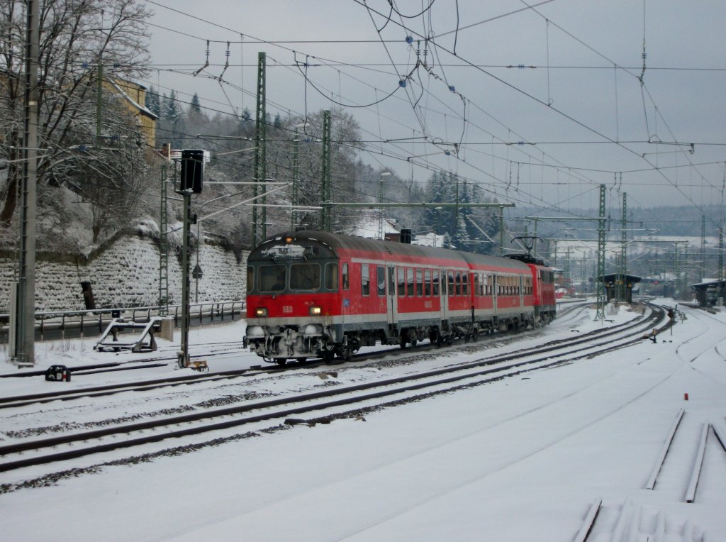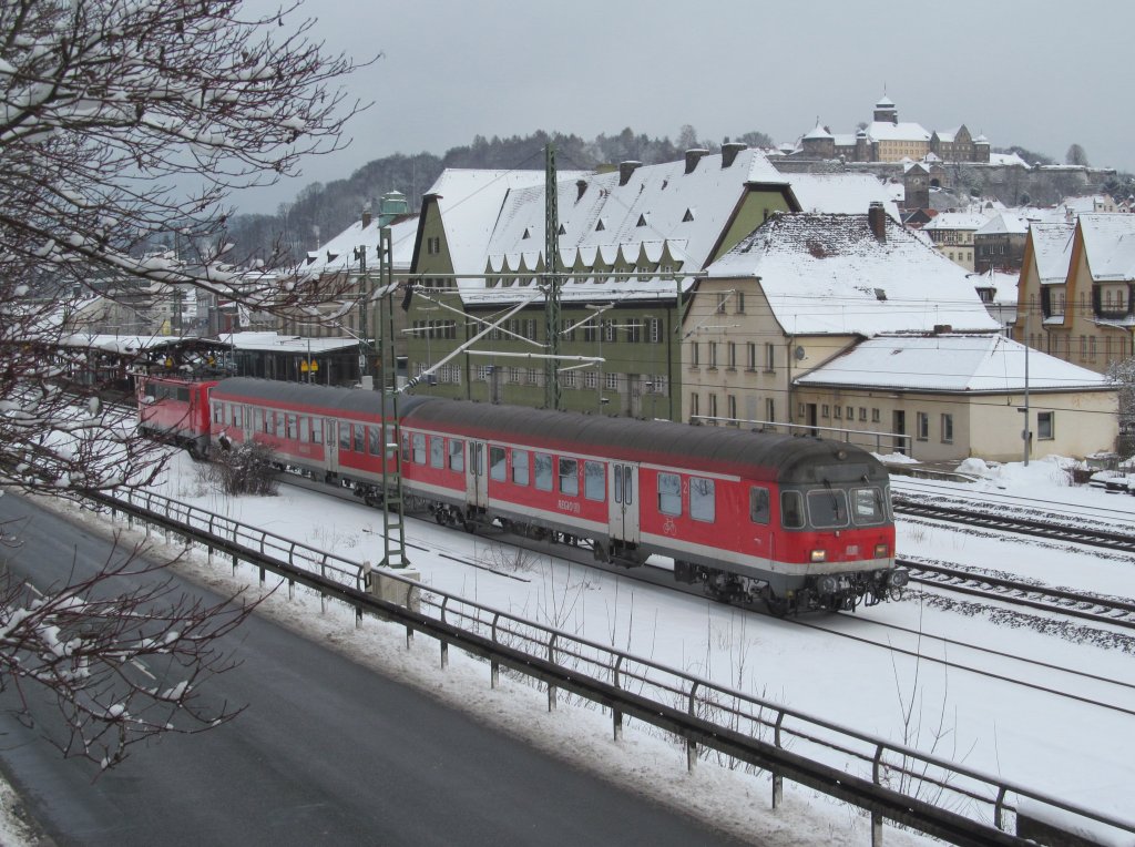 Eine Regionalbahn nach Bamberg verlässt am 09. Februar 2013 den Bahnhof Kronach über Gleis 4.