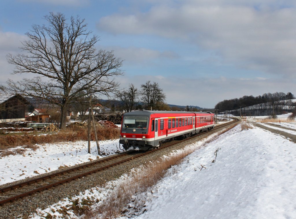 Eine Regionalbahn aus Lindau erreicht Friedrichshafen Stadt, der VT628 wird in Friedrichshafen Stadt Kopf machen und gen Friedrichshafen Hafen fahren, 09.02.2013