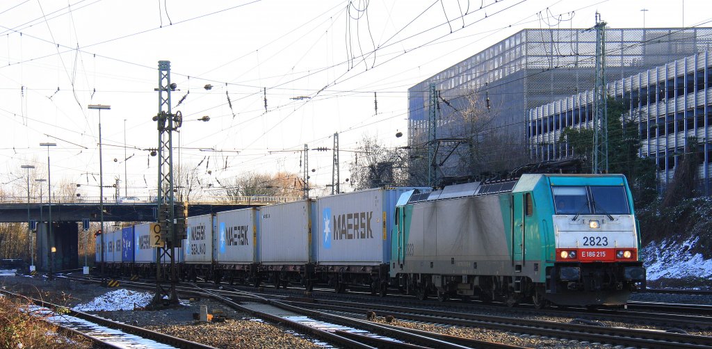 Die Cobra 2823 kommt aus Richtung Montzen/Belgien mit einem langen Maersk-Containerzug aus Antwerpen(B) nach Leipzig und fährt in Aachen-West ein bei schöner Wintersonne am Kalten 9.2.2013.