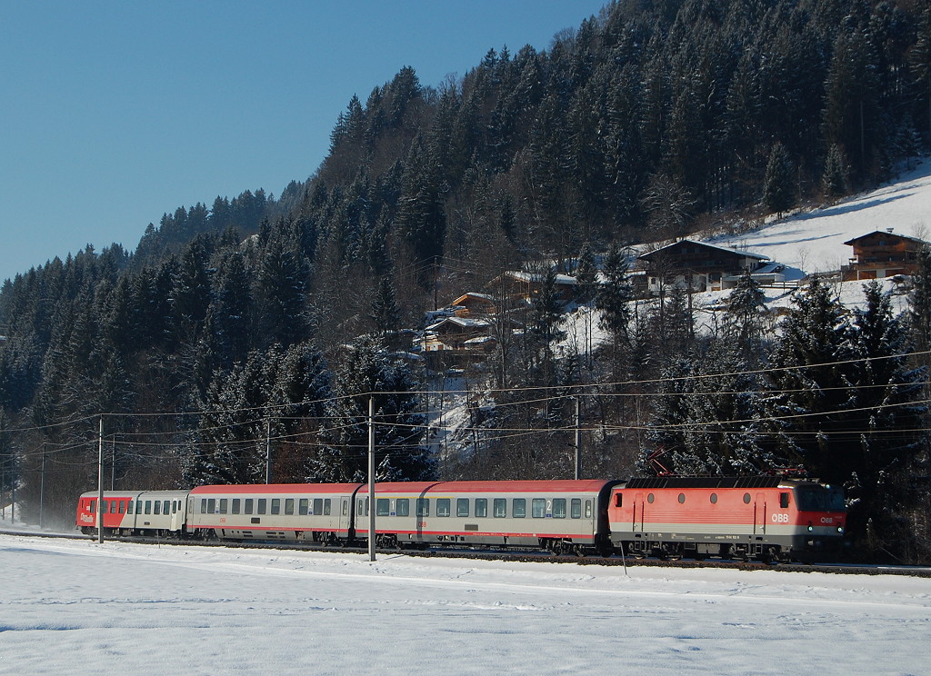 Recht kurz geraten ist der IC 519 am 26. Jänner 2013. An diesem Tag brachte die 1144.103 den Zug von Innsbruck Hbf nach Gaz Hbf und konnte dabei zwischen Kirchberg in Tirol und Kitzbühel-Schwarzsee fotografiert werden. Ein großes Dankeschön ergeht an den Fotokollegen, der mit seinen weitaus besseren WInterschuhen den Weg zum Fotopunkt "spurte" ;-)
