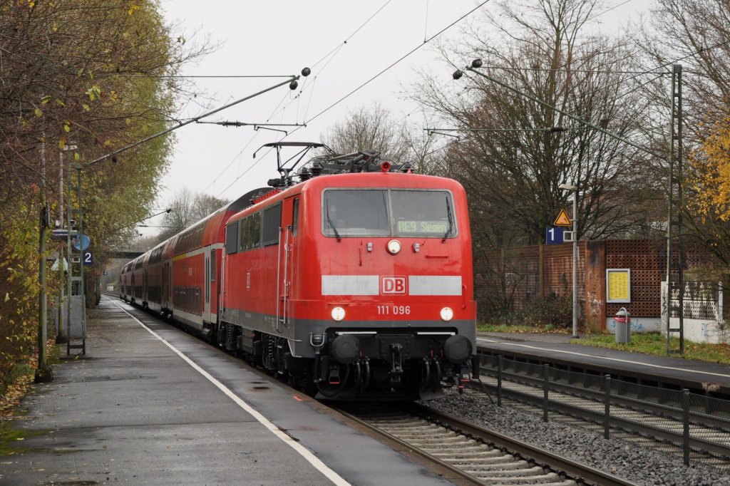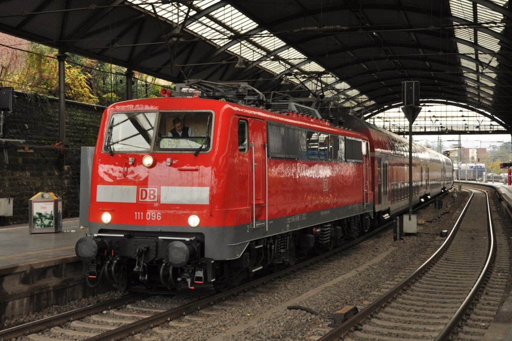 Zwei Wochen vor Einsatzende auf dem RSX steht 111 096 am 24.11.2012 im Aachener Hbf. Die Lok hat offenbar vor kurzem einen Neulack bekommen. Heute fahren auf der Relation Aachen-Siegen hauptsächlich Talent-2-Triebwagen.