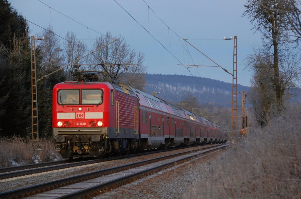 114 038 mit Fußballsonderzug, RE 28956 von Berlin nach Paderborn, am frostigen Morgen des 08.12.2012 bei Langeland.