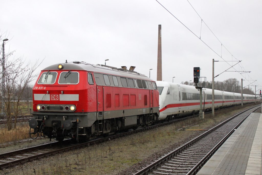 218 831-6 kam mit ICE Ulm im Schlepp über die Stammbahn aus Richtung Stendal. Rathenow,10.01.2013