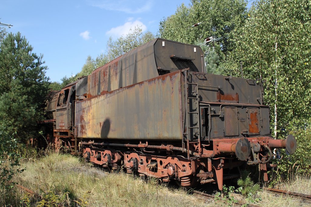 52 8013 am 16.09.2012 im Bw Falkenberg Oberer Bahnhof. Ihr Tender ist am Werzeugkasten beschädigt, siche die Spuren eines Unfalls. Das Gelände dient nur zur Aufbewahrung von Fahrzeugen und ist nur an wenigen Tagen im Jahr zugänglich.