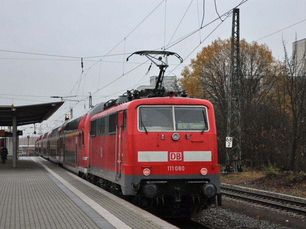 Am Ende eines RSX-Zuges nach Siegen ist am 24.11.2012 in einer Sandwich-Traktion 111 080 aktiv.