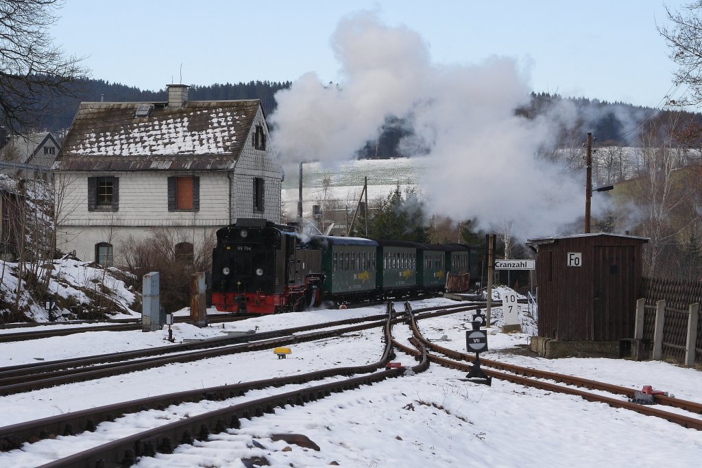 Am Mittag des 30.12.2012 fährt 99 794 mit P1002, aus Oberwiesenthal kommend, im Bahnhof Cranzahl ein.
