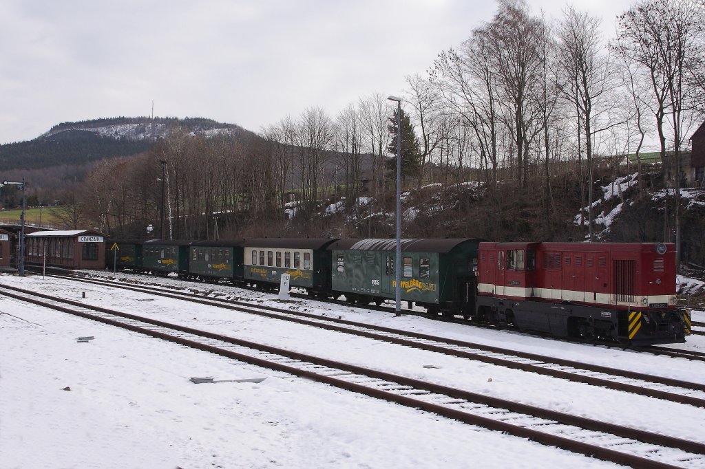 Diesellok L45H-083 als Schublok an P1002 am 30. 12.2012 bei der Einfahrt in den Bahnhof Cranzahl. An der Zugspitze befindet sich Dampflok 99 794 (nicht im Bild). Aufgrund des großen Fahrgastandrangs waren an diesem Tag die Züge der Fichtelbergbahn besonders lang und wurden deshalb in Doppeltraktion gefahren!
