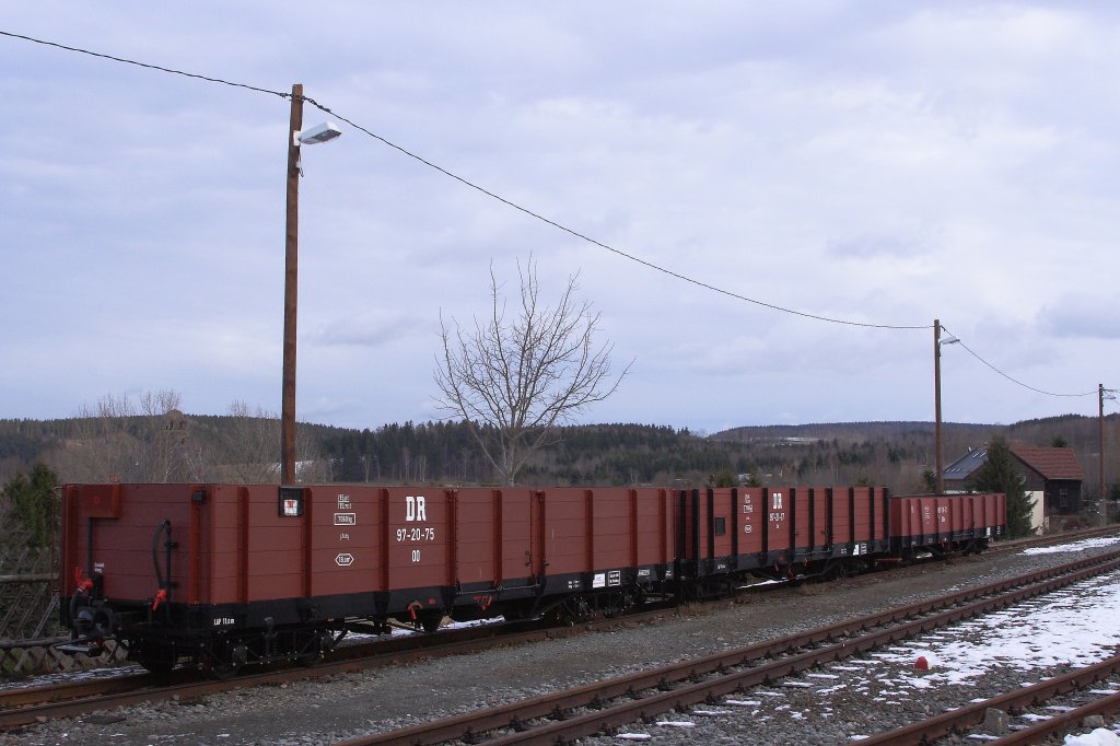Eine Garnitur aus drei neu restaurierten Güterwagen, gesehen am 30.12.2012 im Bahnhof Cranzahl.