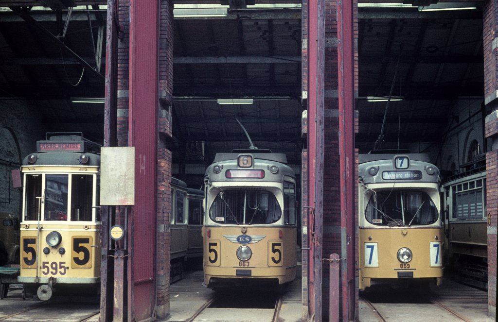 København / Kopenhagen KS: In der Wagenhalle des Betriebsbahnhofs Nørrebro halten am 8. April 1971 der Grossraumtriebwagen 595 und zwei Düwag-Gelenktriebwagen (863 und 859).