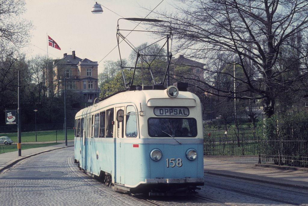Oslo Oslo Sporveier: SL 9 (Tw 158) Drammensveien am 8. Mai 1971. - Triebwagen dieses Typs wurden 'Goldfische' genannt.