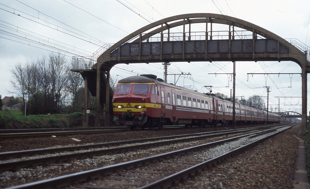 Am 28.03.1997 ist SNCB Elektrotriebzug 818 nach Brüssel unterwegs.