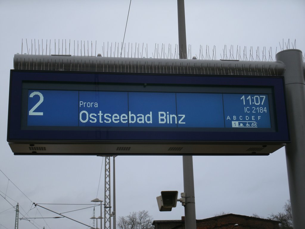 Zugzielanzeiger für IC 2184 aus Hannover nach Binz mit Halt sogar in Prora.Aufgenommen am 04.Januar 2013 in Bergen/Rügen.