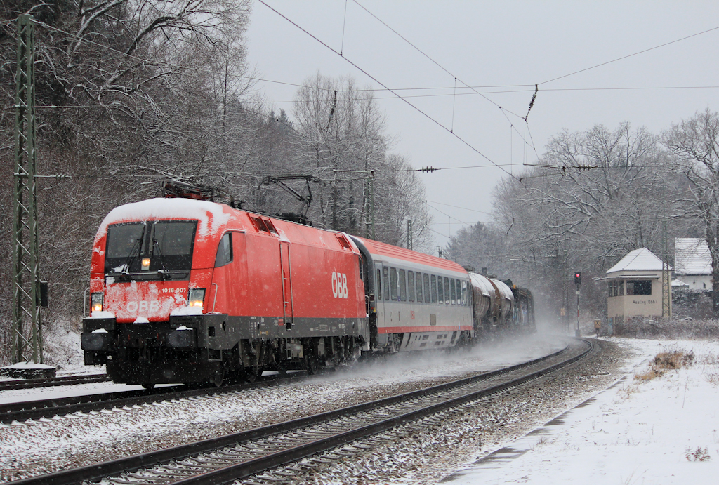 1016 007 mit einem gemischten Güterzug inklusive eines EC Wagens am 12.01.2013 in Aßling.
