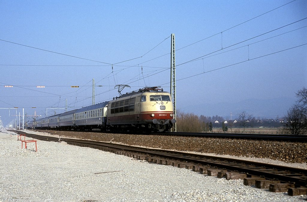 103 245-7 am 29.04.2011 in Ulm Hbf. Nach Ankunft als IC 2094 aus München sind Lok und Wagen bereit für die Rückfahrt als Leerzug nach München. Zuvor startet aber der ICE an Gleis 2 nach München.