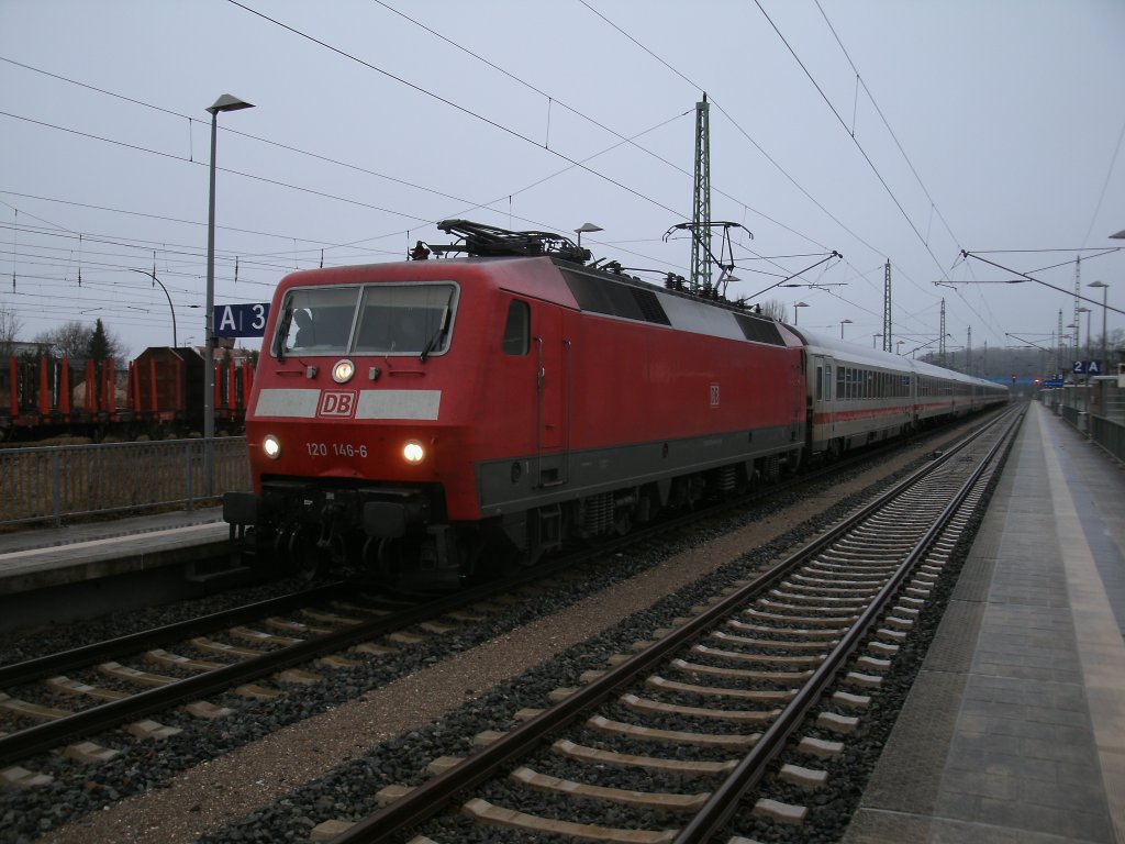 120 146 mit dem IC 2377 Binz-Frankfurt/Main,am 06.Januar 2013,in Bergen/Rügen.
