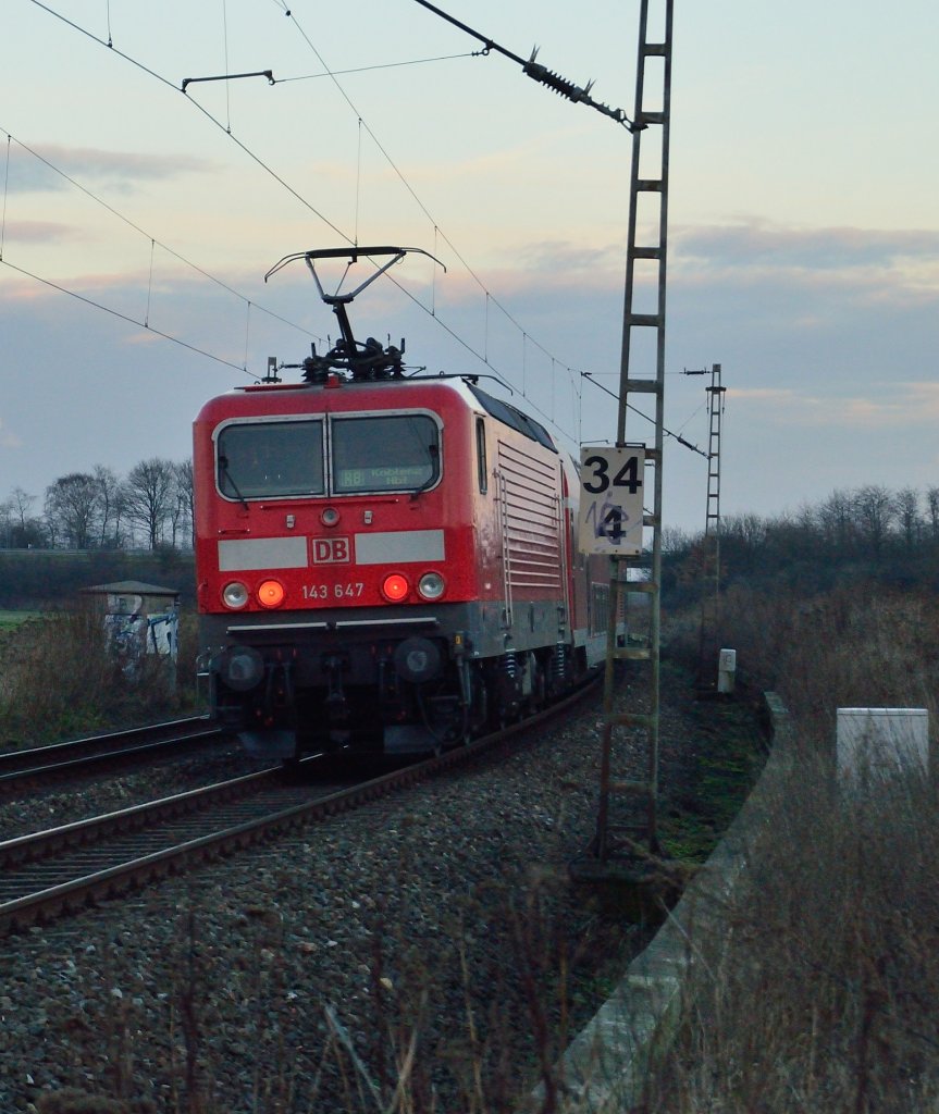 Die 143 647 auf dem Weg nach Mönchengladbach mit einer RB 27, die nur Werktags verkehren. 11.1.2013