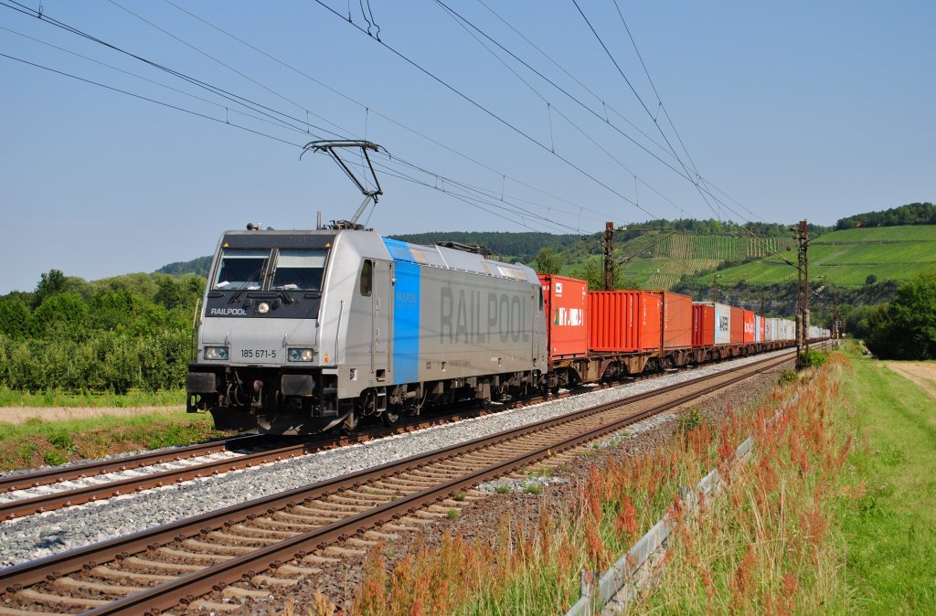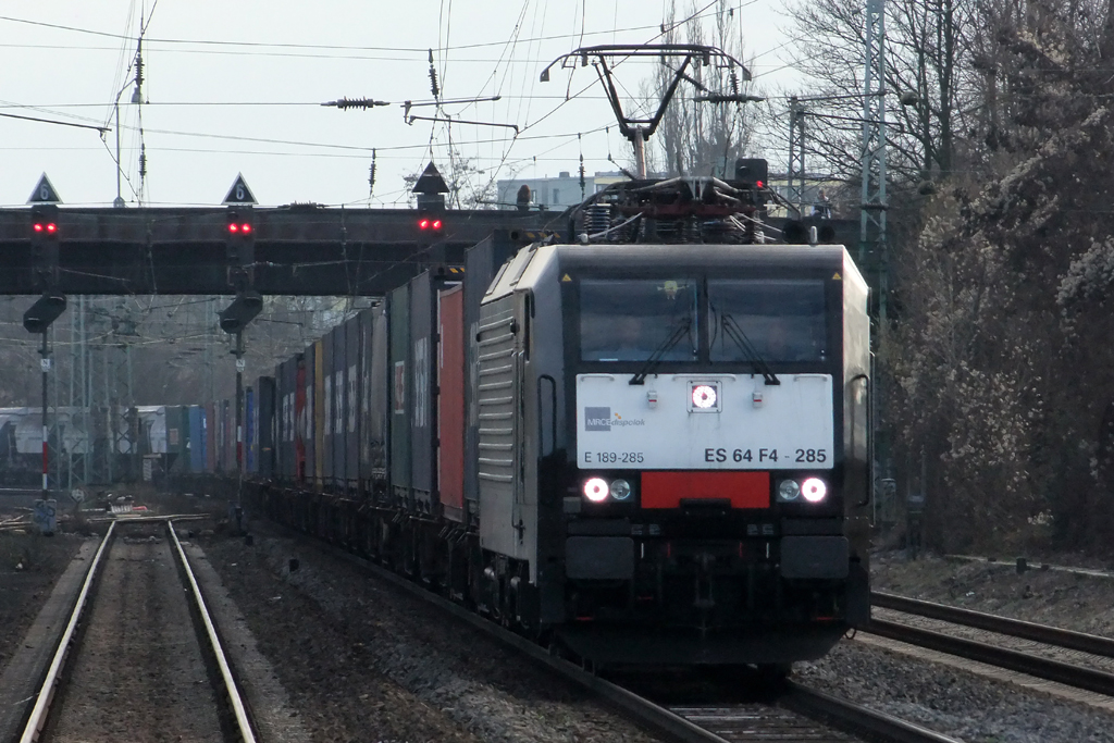 155 196-9 von MEG steht in Aachen-West mit einem sehr langen Maersk-Containerzug bei schöner Wintersonne am 13.1.2013.