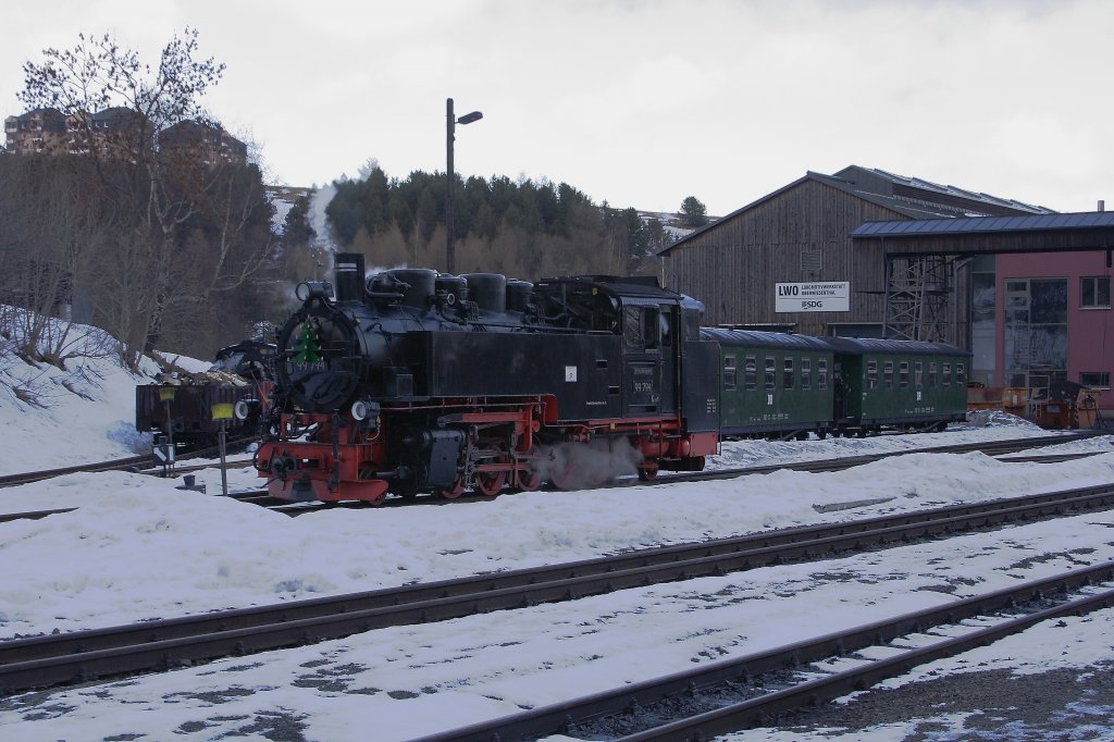 99 794 am Mittag des 30.12.2012 im Bahnhof Oberwiesenthal auf Fahrt ins Bw zum Wasserfassen.
