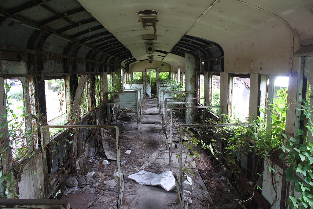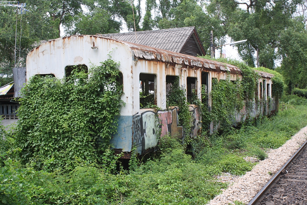 Während die Triebwagen der Type RH und RHN, sowie die dazugehörigen Steuerwagen zur Zeit generalüberholt werden, scheint man auf den zuletzt auf der Mahachai-Line im Einsatz gewesenen พซข.27 vergessen zu haben; Ausgeschlachtet verrottet er etwa 1,5 Km ausserhalb des Bf. Mahachai. Bild vom 24.Juli 2012.