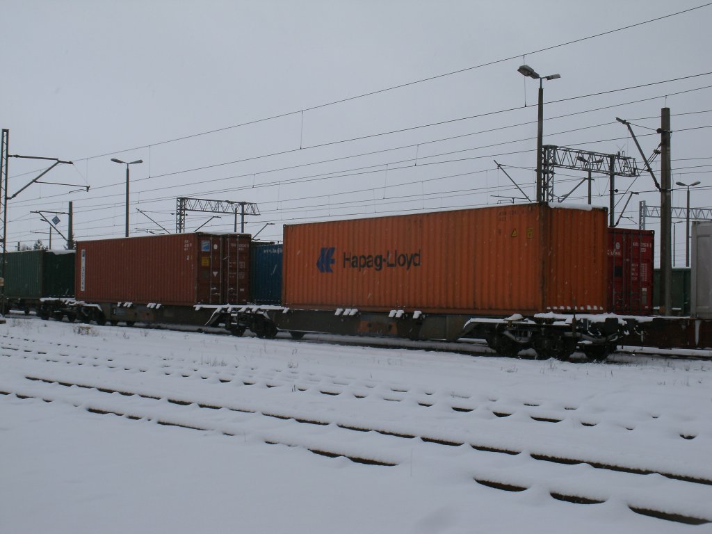 Deutscher Containerwagen im polnischen Grenzbahnhof Szczecin Gumience am 12.Januar 2013.