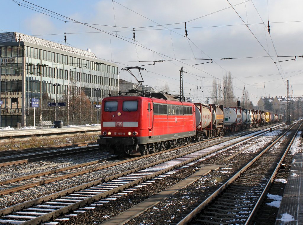 Die 151 014 mit einem KLV-Zug am 01.12.2012 bei der Durchfahrt am Heimeranplatz (München).