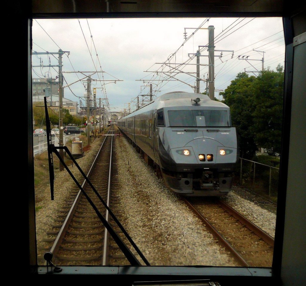 Serie 787 (Wechselstrom-Intercityzüge auf der Südinsel Kyûshû): Ein 7-Wagenzug in Kasuga in der Stadt Fukuoka, geführt von KUMORO 787-11. 28.November 2010. (Bild durch die verglaste Führerstandrückwand eines Lokalzugs) KAGOSHIMA HAUPTLINIE (NORD)