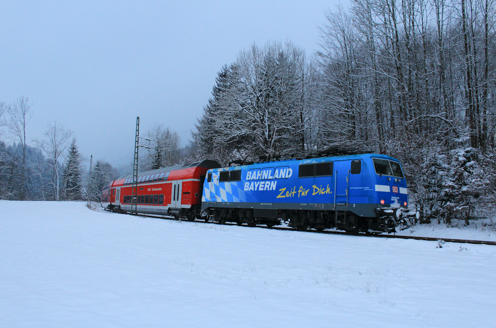 111 017  Maxl  mit einer RB auf dem Weg nach Traunstein. Aufgenommen beim Haltepunkt Höpfling am 13. Januar 2013.