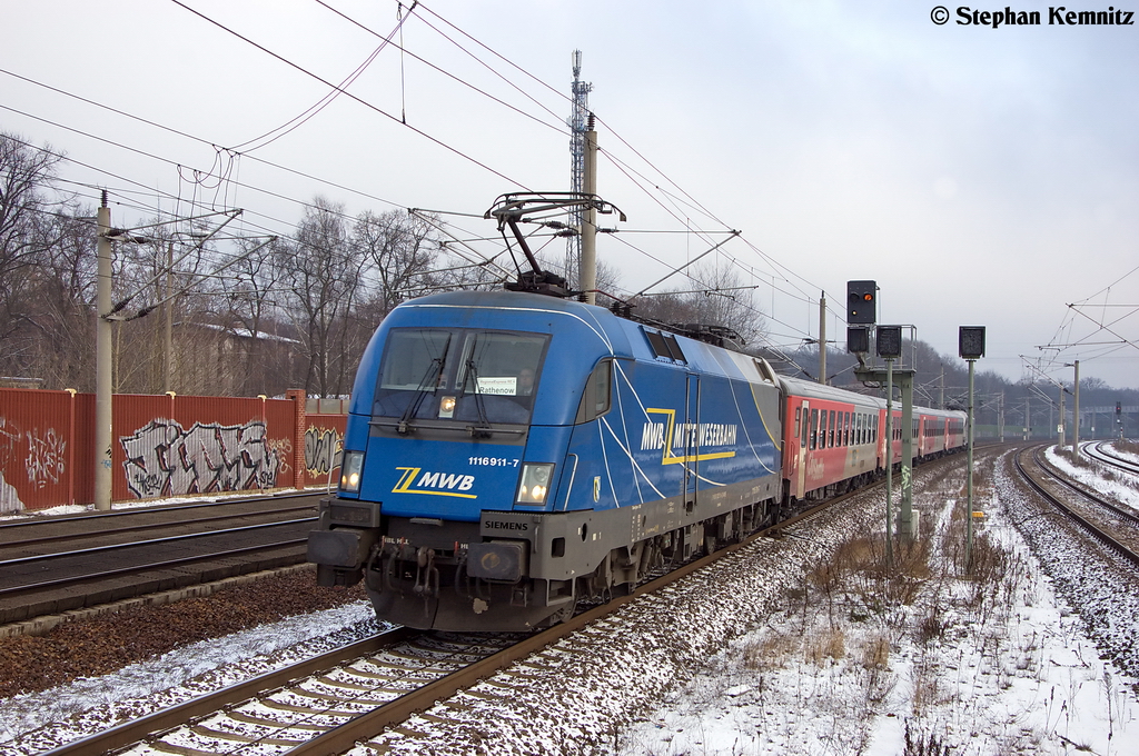 Im Zuge des ODEG-Ersatzverkehrs kam am 12.01.13 1216 901 der RTS zusammen mit 182 912 der MWB an der Doppelstockgarnitur des Metronoms zum Einsatz. Hier hat der Zug Ludwigsfelde erreicht und wird nach ca. 1 Stunde Aufenthalt wieder zurück nach Rathenow fahren.