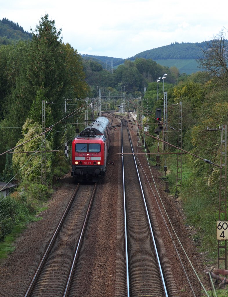 Mit Neulack und ohne Prüfziffer... präsentiert sich 143 919 auf der KBS 685 bei Serrig. Die Lok bringt ihren Regionalexpress von Koblenz nach Saarbrücken, zuerst an der Mosel entlang und ab Konz bis Saarbrücken entlang der Saar. 29.09.2012