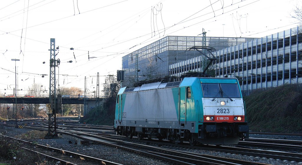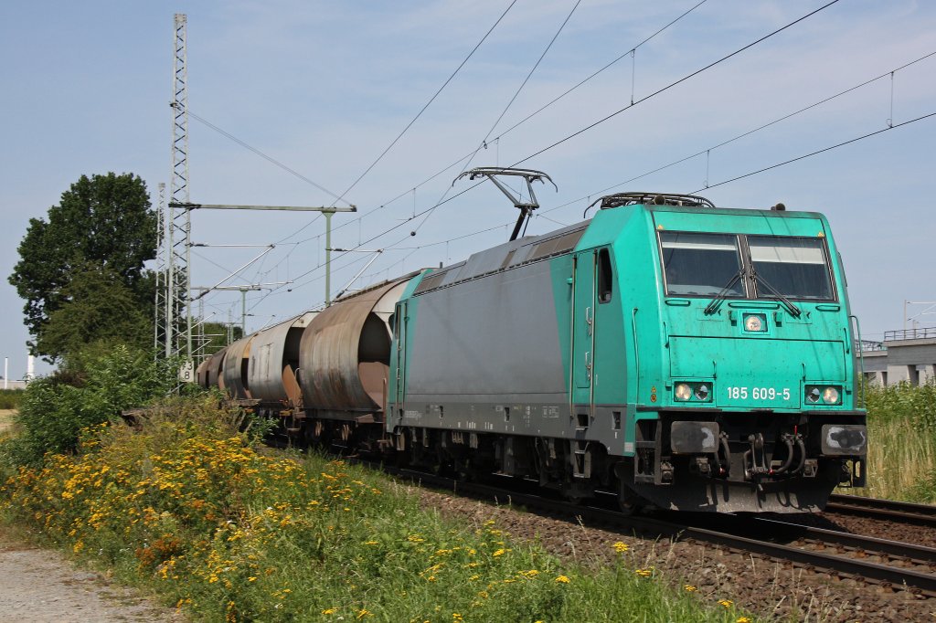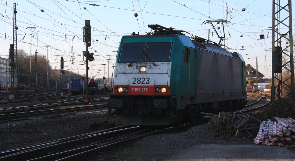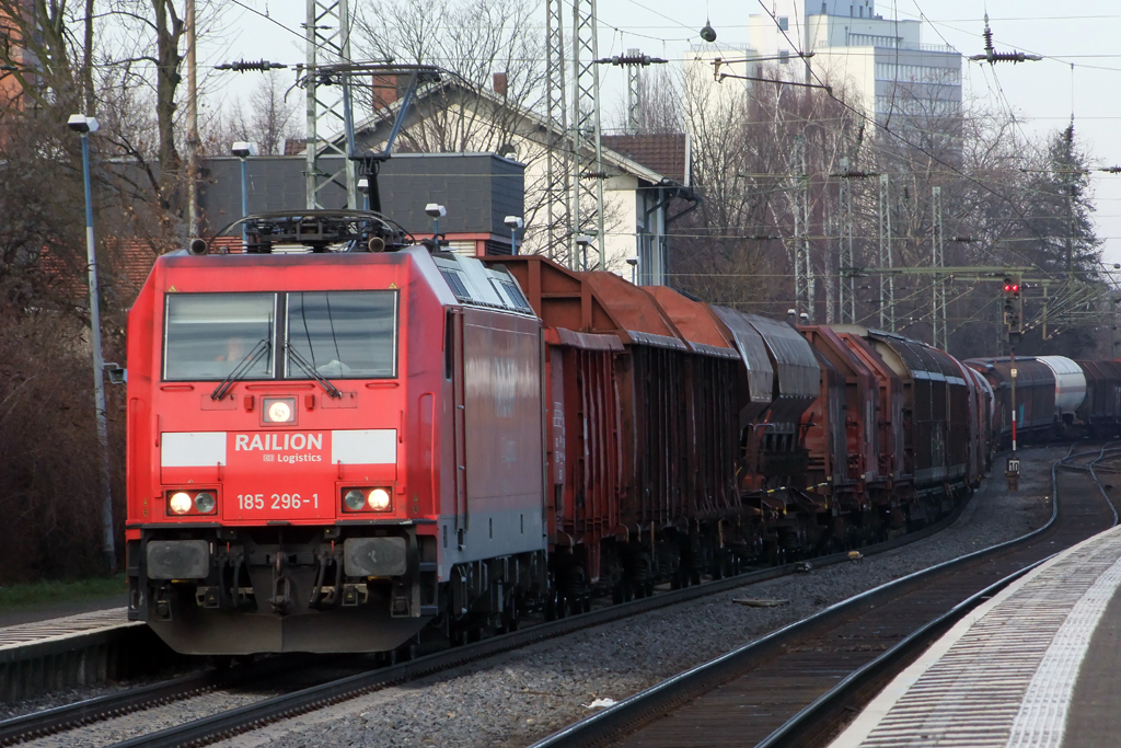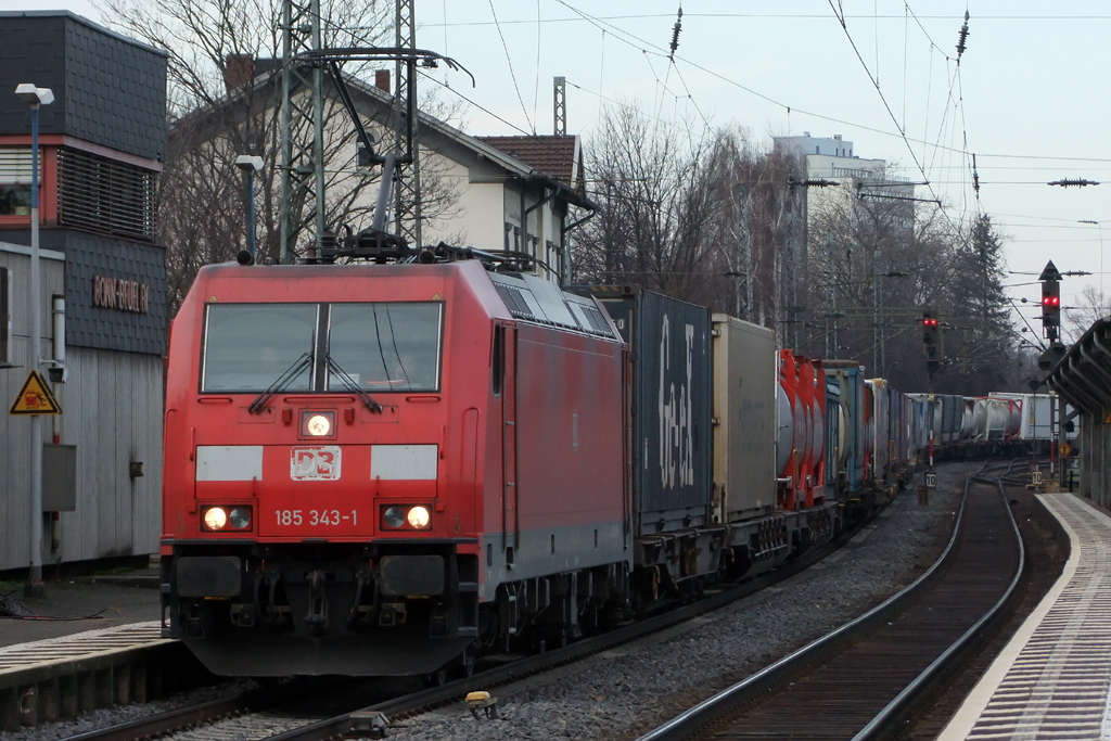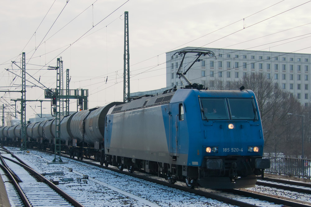 185 174-0 und 185 185 019-7 beide von der DB fahren mit einem sehr langen Ölzug aus Antwerpen-Petrol(B) nach Basel(CH) bei der Abfahrt aus Aachen-West und fahren in Richtung Köln bei schönem Winterwetter am 13.1.2013.