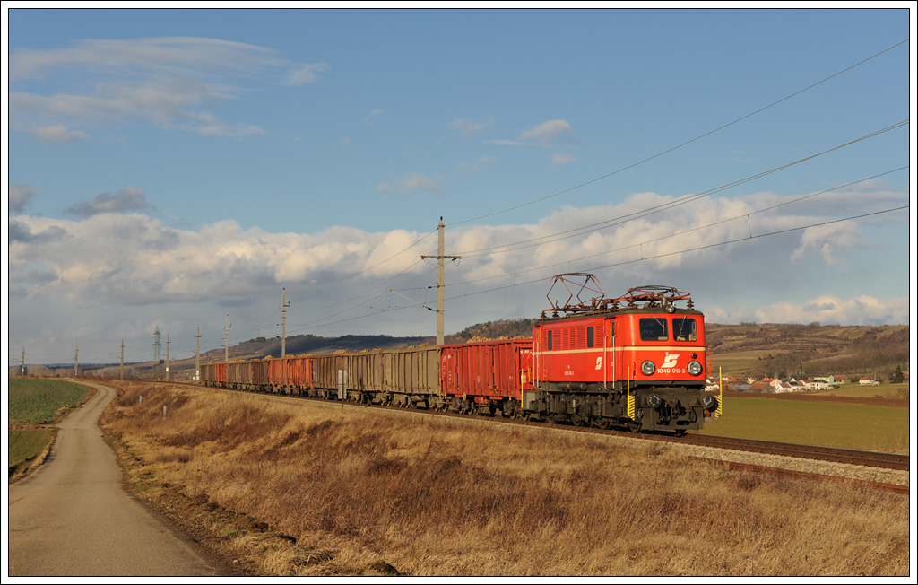 1040 013 vom Club 1018 mit dem Vollrübenzug 59111 von Ziersdorf nach Tulln am 11.1.2013. Da ich meinen Blumax zu Hause vergessen habe, kann ich leider keine genaue Ortsangabe machen.