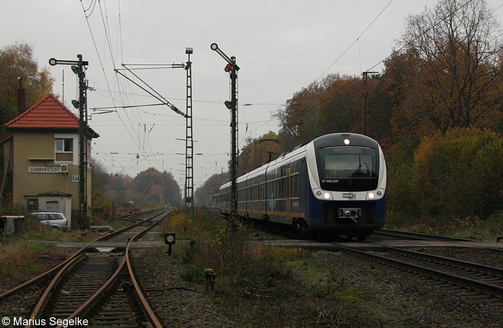ET 440 219 verlässt als RS2 von Bremerhaven-Lehe nach Twistringen den Bahnhof Lübberstedt. Die Aufnahme entstand mit Zustimmung des Fahrdienstleiters! Aufgenommen am 10.11.12
