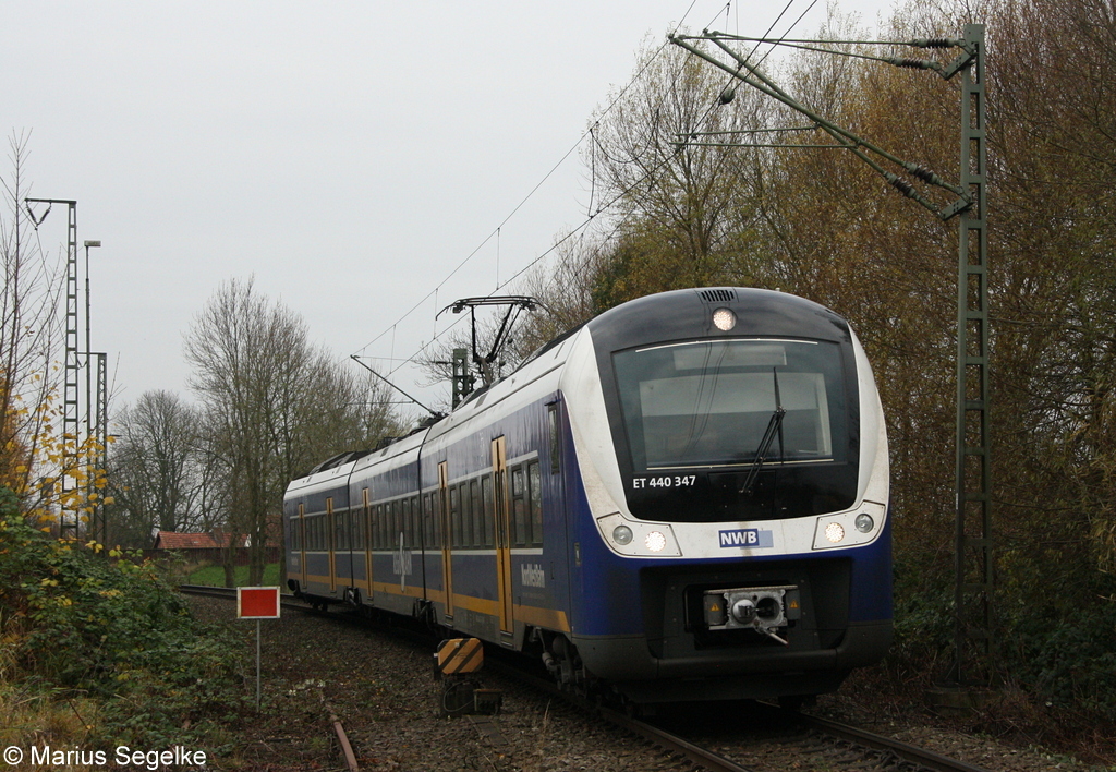 ET 440 347 konnte am 10.11.12 als RS4 von Bremen Hbf nach Nordenham bei der Einfahrt in den Bahnhof Elsfleth aufgenommen werden