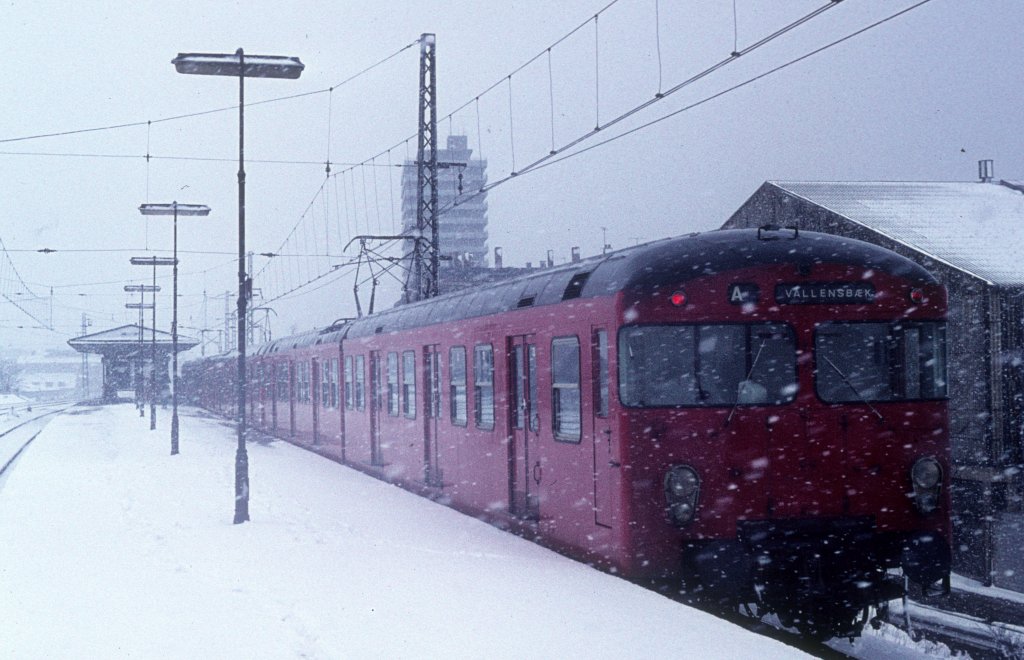 DSB S-Bahn im März 1975: Ein Zug der Linie B verlässt Jægersborg station, den S-Bf Jægersborg, in Richtung Holte. - Rechts sieht man undeutlich das Übergangsgleis zur Privatbahn LNJ, Lyngby-Nærum-Jernbane.