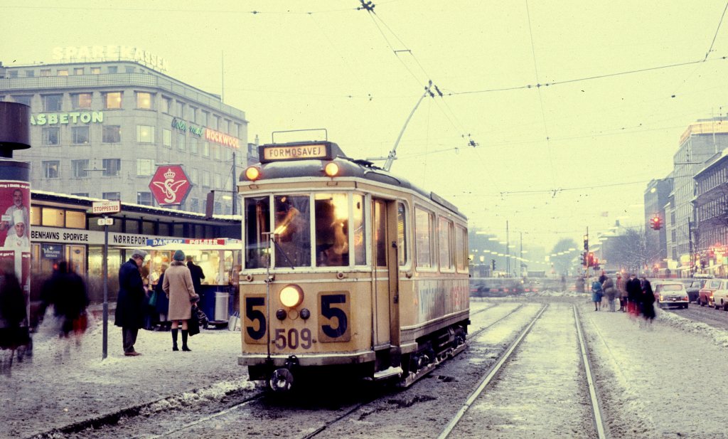 København / Kopenhagen Københavns Sporveje (KS) SL 5 (Tw 509) Nørreport station (: DSB-Bf Nørreport) am 13. Februar 1970. - Der Triebwagen fährt in Richtung Formosavej auf der Insel Amager.